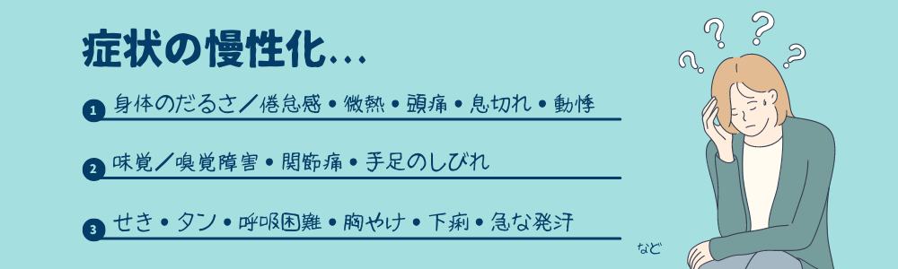 新型コロナウイルスに感染した後、十分な日数が経過したのに微熱や倦怠感・強い疲労感・しびれ・呼吸苦・頭痛・食欲不振などの症状が慢性化している方々が、日本に限らず世界中で報告されています。また、このような後遺症は感染時の症状の程度にかかわらず、どの年代にもみられています。20代・30代の発症割合も高いと言われています。